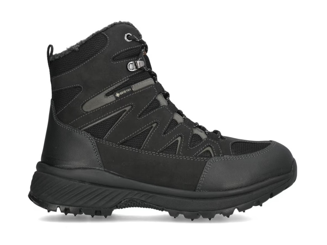 Urbs Hamilton GTX från Polecat – multifunktionella kängor med vattentätt membran och dubbar. Ovandelen är tillverkad i oljad svart nubuck med textilpartier för bättre ventilation och förstärkning i skinnimitation bakom hälen och vid tårna. Utrustade med Gore-Tex® vattentäta membran som håller fötterna torra under stadspromenaden och på vandringen. På insidan finns ett fleecefoder som håller fötterna varma under kallare dagar, kombineras med en uttagbar innersula – perfekt för dig som önskar en bredare läst eller har egna inläggssulor. Modellen har en yttersula i slitstarkt gummi med dubbar undertill som ger optimalt grepp på kalla unde